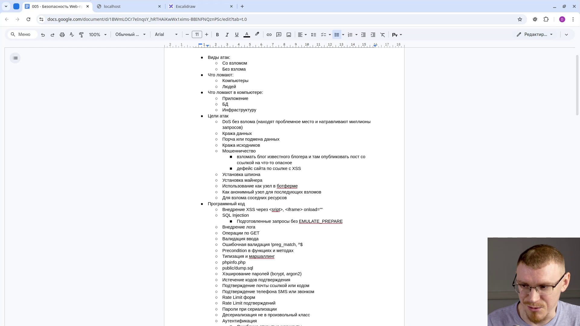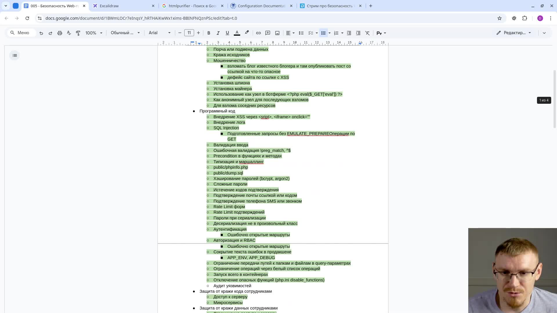 На стриме провели исследование разных видов атак. Обсудили с примерами написание безопасного программного кода на бэкенде и во фронтенде. Разобрали хеширование и шифрование данных. Защитили HTML-формы от подлога и API от перебора. Сделаели невозможным внедрение постороннего JavaScript через фильтрацию и через политики безопасности браузеров. Дополнительно защитили аутентификацию по OAuth2. Разобрались с защитой инфраструктуры в Linux нативно и в Docker-контейнерах. Подобрали нструменты для проведения аудита и поиска уязвимостей. Организовали для своего проекта соблюдение технических требований к обработке персональных данных, резервному копированию и мониторингу по закону №152-ФЗ.